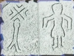 Details aus dem Bildstein: Frauen- oder Männergestalt mit einem kittelähnlichen Gewand, einen Phallus und ein Swastika-ähnliches Sonnensymbol; Rekonstruktion der Ritzungen